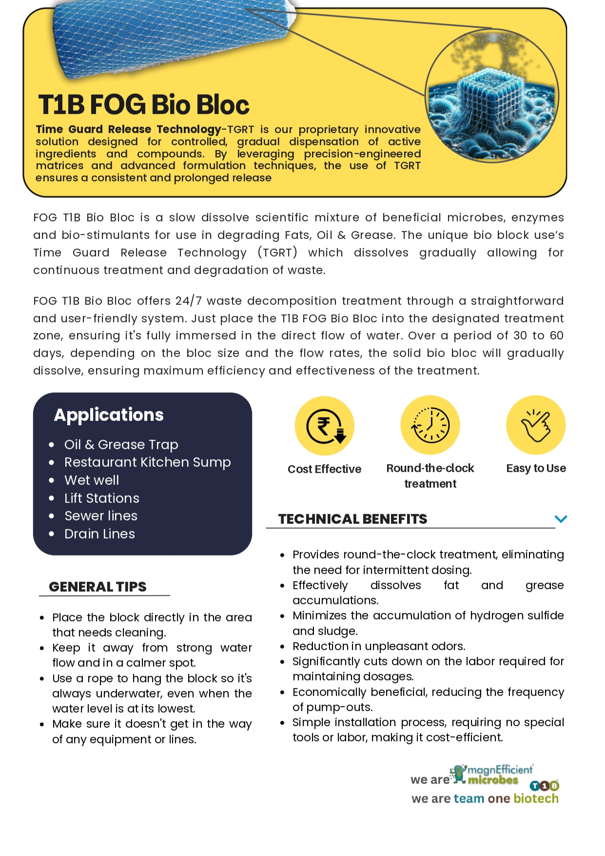 FOG T1B Bio Bloc is a slow dissolve scientific mixture of beneficial microbes, enzymes and bio-stimulants for use in degrading Fats, Oil & Grease. The unique bio block uses Time Guard Release Technology (TGRT) which dissolves gradually allowing for continuous treatment and degradation of waste.